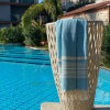 De Hamamdoek Plaj powder blue heeft een prachtig weefdessin wat deze hamamdoek zo bijzonder maakt. Deze Hamamdoek heeft een zigzag weefpatroon. Aan de uiteinde heeft deze Hamamdoek lichte strepen. Ze zijn geproduceerd van 100% katoen. Ga je op vakantie dan mag een Hamamdoek Plaj in de kleur powder blue zeker niet ontbreken in je koffer. Ook voor naar de sauna, het strand of een dagje uit is een hamamdoek ideaal. Deze hamamdoek is zeer licht (460 gr) en heel klein op te vouwen, dus ideaal als je niet zo veel plek hebt in je koffer of rugzak. De fringes (kwastjes) worden door vrouwen met de hand gedraaid en geknoopt. Een echte Turkse ambacht waar men zeer trots op is. Kleur en gewicht kunnen verschillen en kleine weeffoutjes horen bij dit ambachtelijk product. Dit doet zeer zeker niet af aan de kwaliteit van deze kwalitatieve hamamdoek. De Hamamdoek Plaj is in verschillende mooie kleuren verkrijgbaar.
