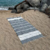 De hamamdoek Sea Me black beige heeft een prachtig weefdessin met strepen wat deze hamamdoek zo bijzonder maakt. Deze chique fairtrade hamamdoek heeft strepen en is in verschillende kleuren strepen verkrijgbaar. Ze zijn geproduceerd van 100% biologisch katoen. De fringes (kwastjes) worden door vrouwen met de hand gedraaid en geknoopt. Een echte Turkse ambacht waar men zeer trots op is. Kleur en gewicht kunnen verschillen en kleine weeffoutjes horen bij dit ambachtelijk product. Dit doet zeer zeker niet af aan de kwaliteit van deze kwalitatieve hamamdoek. De hamamdoek Sea Me heeft het formaat 95 x 200 cm.